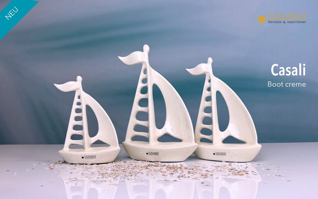 Das Deko-Boot Casali in creme-weiß bringt maritimes Flair in Dein Zuhause. Mit seinen filigranen Details und der eleganten Segelform erinnert es an sommerliche Tage am Meer und verleiht Deiner Dekoration eine stilvolle Leichtigkeit.