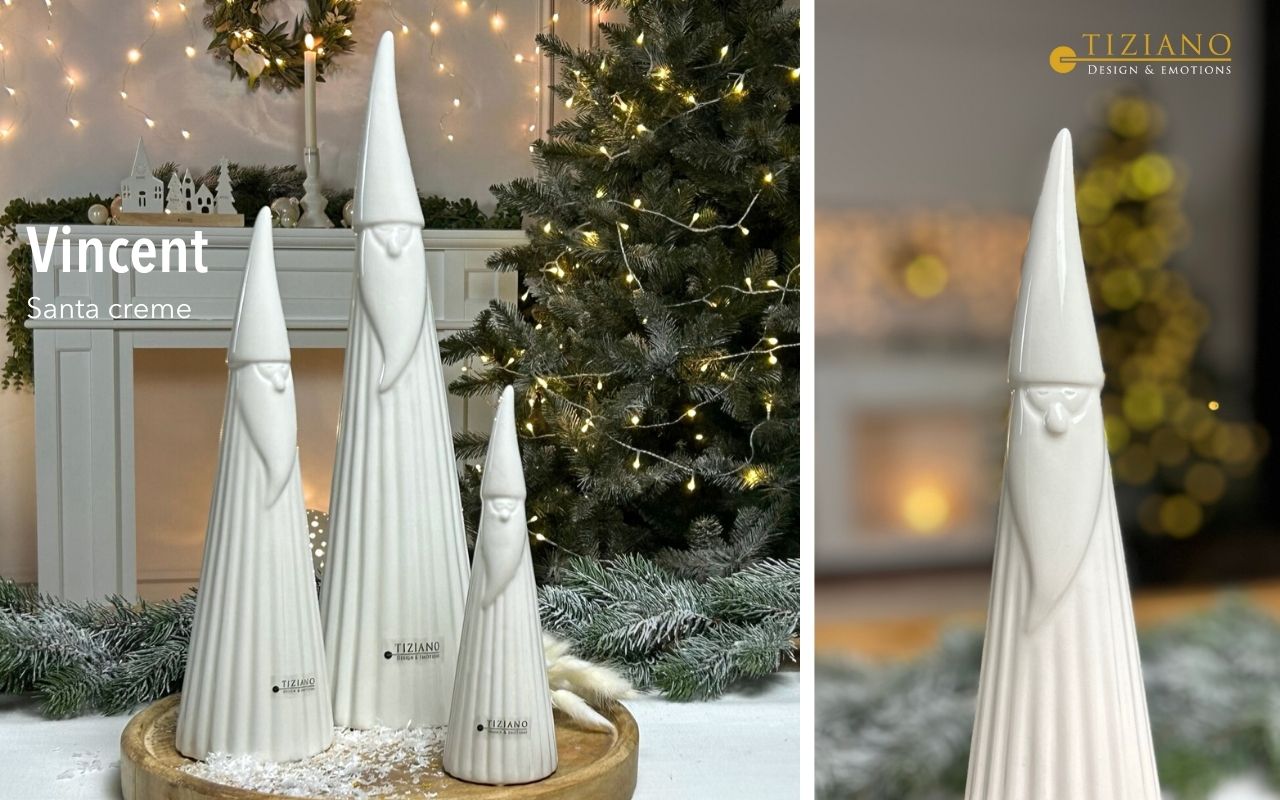 Sorge mit unserem Deko Weihnachtsmann weiß creme für eine wunderschöne und moderne Weihnachtsdekoration! Vincent besteht in dieser Variante aus cremeweiß glasierter Keramik. Durch sein langes Gewand und den langen Bart sieht er sehr elegant aus.