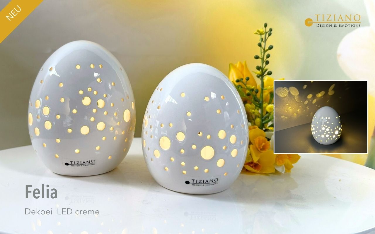 Für einen strahlenden Auftritt an Ostern sorgt unser tolles LED Deko Ei weiß-creme pearl. Das Dekoei besteht aus Keramik und ist cremefarben mit einem Perlmutteffekt glasiert. Das Ei hat verschieden große punktförmige Auslassungen, durch die die LED-Beleuchtung nach außen scheinen kann. Das leuchtende Ei eignet sich besonders gut als Oster-Dekoration auf dem Sideboard oder der Fensterbank. Die LED-Beleuchtung wird mit Batterien (2xAAA) und einem Timer betrieben. Mithilfe des Timers schaltet sich die LED-Leuchte ganz von allein nach 6 Stunden ab und nach weiteren 18 Stunden wieder ein.