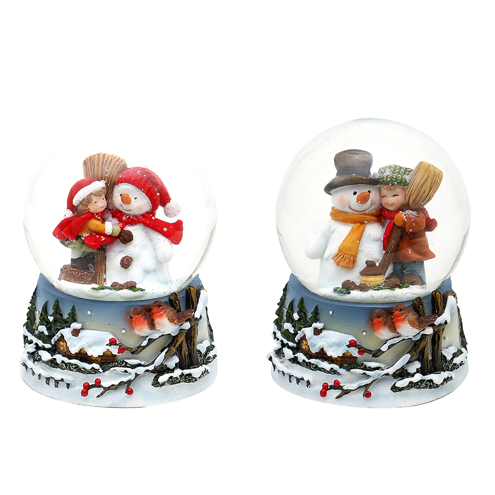 Diese Schneekugel Schneemann mit Kind und Vögel in Winterlandschaft lässt die Augen leuchten.
